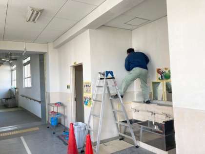 管理作業員の日野さんです。手洗い場の壁に白いペンキを塗ってくださっています。
