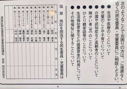 塩草地域と立葉地域の民生委員・児童委員の皆さまです。いつもありがとうございます。子育てやくらしのことをはじめ、さまざまな相談に乗ってくださっています。