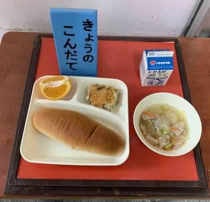 押麦のグラタン、豚肉と野菜のスープ、いよかん、黒糖パン、牛乳 です。