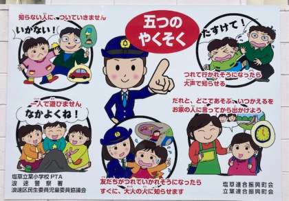 トラブルに巻き込まれないためにも、子どもだけで校区外の商業施設や遊戯施設などに行かないことや遊びに出かけるときは、お家の人に「だれと」「どこであそぶ」「いつ帰る」を伝えるよう、あわせてお話いただければと思います。どうぞよろしくお願いします。