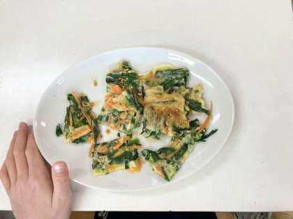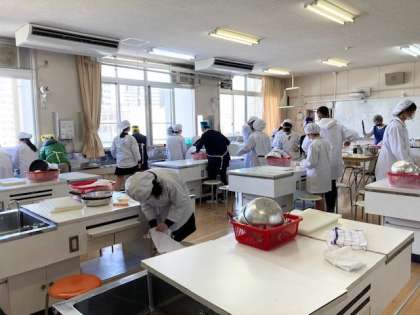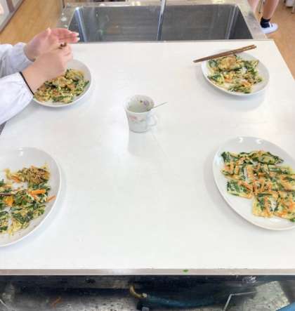 家庭科の調理実習。チヂミを作りました。1組も2組も、とてもおいしイギー。