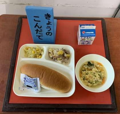 中華おこわ、卵スープ、キャベツのオイスターソースいため、大型コッペパン、ブルーベリージャム、牛乳 です。