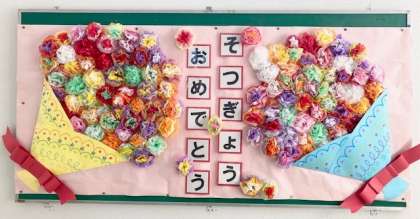 在校生が作ったお祝いメッセージのひとつです。階段の大型ボードにはっています。