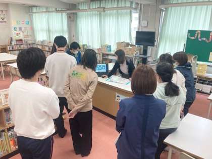 先生方が、図書貸出用のパソコン操作を研修しています。