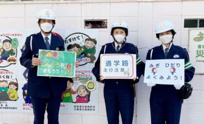 入学式に来られるお子さんに、交通安全のメッセージを伝えてくださっています。浪速警察署の皆様、大阪府警察のマスコット、フーくん、ケイちゃん、ありがとうございます。