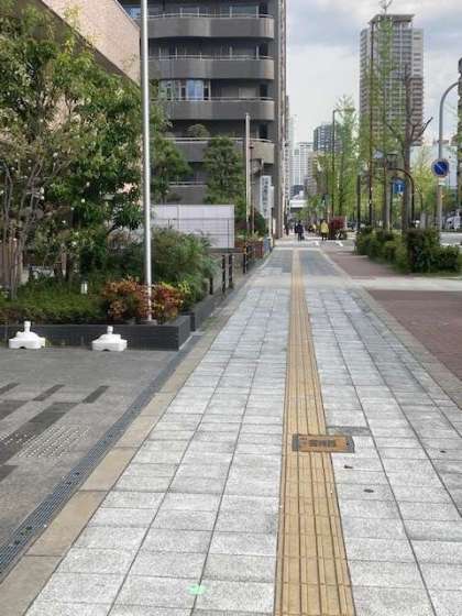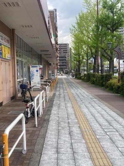 登校時、なにわ筋ぞいの歩道は、自転車の往来が多いです。事故を避けるために、黄色い点字ブロックの右側を通るようにしましょう。