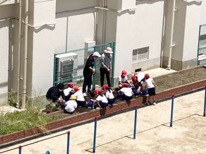 1組 学習園に野菜を植えています
