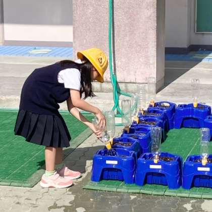 今朝、1年生のお友だちがあさがおに水をあげていました。育っていきますように。