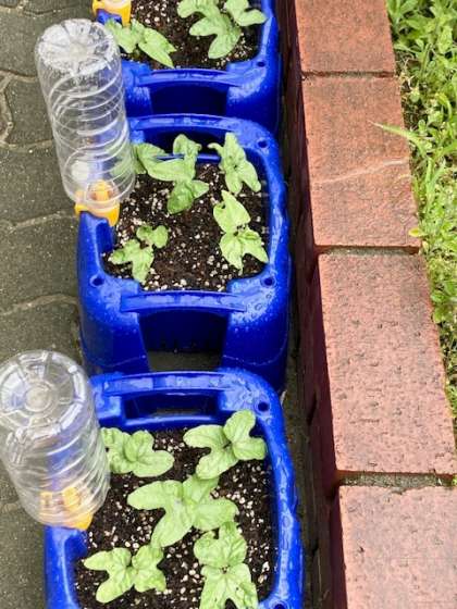今朝は、あいにくの小雨ですが、1年生が育てているアサガオちゃんにはいいかもしれません。育ってきています。