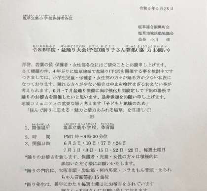 塩草連合振興町会・塩草地域活動協議会(小川 進会長)の皆さまが、企画してくださっています。夏の盆踊り大会に向けて、塩草立葉小学校の体育館で練習をします。詳しくは、あさって、お子さんにプリントを配りますので、ぜひご参加ください。