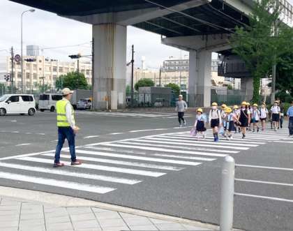 今朝の新なにわ筋(立葉地域)交差点です。子どもたちの見守りや付き添いをしてくださり、ありがとうございます。