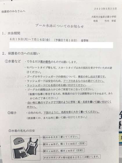 来週から、プール水泳がはじまります。同意書の提出をよろしくお願いします。