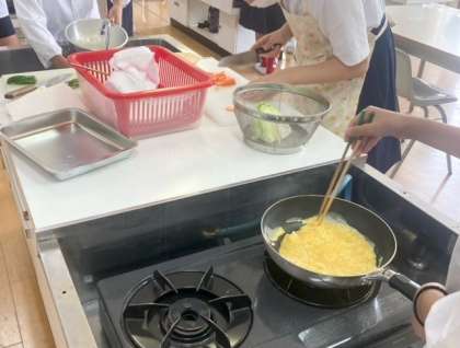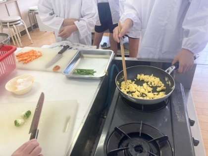 上・中 1組 家庭科 三食野菜いため、スクランブルエッグ