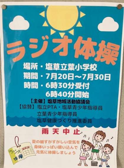夏休みといえば、ラジオ体操。みんな、集まれ〜。PTA、地域の皆さん、ご協力ありがとうございます。