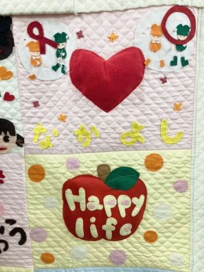 上の写真は、エイズ患者、HIV感染者への想いをこめたキルトです。
