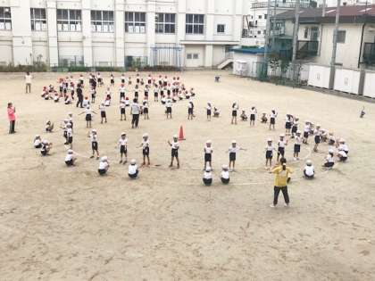 運動場で、1年生全員集合