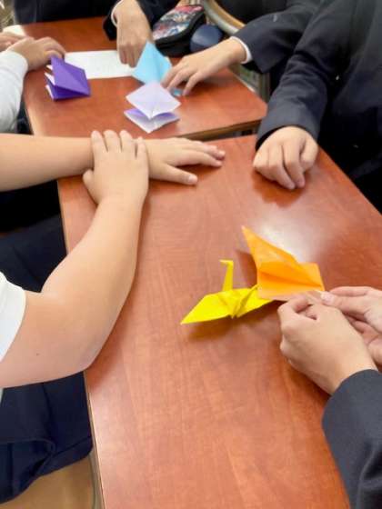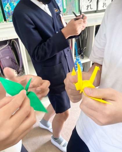 上・中 1組 鶴を折っています。
