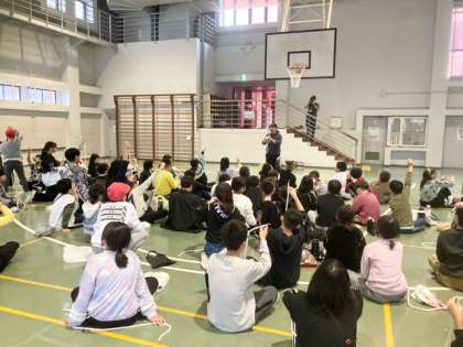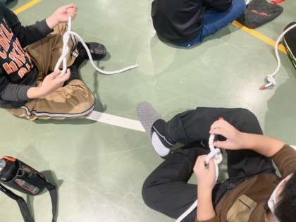お腹がいっぱいになりました。体育館で、ロープクラフトを楽しんでいます。