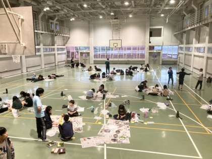 飯盒炊さんの後は、予定を変更して、体育館でロープクラフトと石ころアートを楽しんでいます。