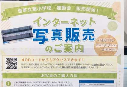 10月に行った運動会の写真をネット販売します。申し込み方法やID、パスワードなどを示したプリントを子どもたちに配ります。問い合わせ先もプリントに載せていますので、よろしくお願いします。