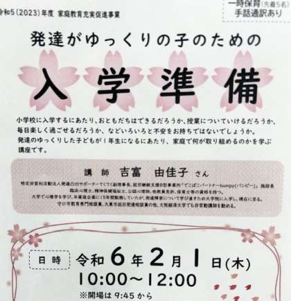 小学校入学をひかえて、お子さんの発達がゆっくりでご心配やご不安をお持ちの方を対象とした講座です。4月から1年生になるお子さんをお持ちの方で、関心がありましたら直接お申し込みください。