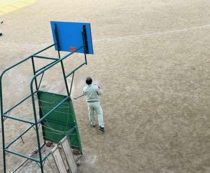 管理作業員の日野さん。寒い中、運動場の側溝にたまった砂を清掃してくださっています。いつもありがとうございます。