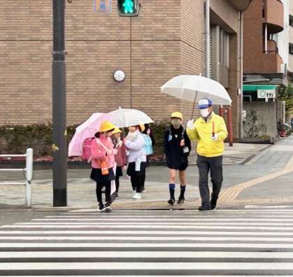 今朝の稲荷交差点です。地域の見守り隊をはじめ、子どもたちに付き添ってくださる保護者、地域の皆様、ありがとうございます。今朝は、浪速警察署 JRなんば駅前交番の署員の方もお越しくださいました。