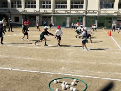 体育「おにあそびゲーム」の授業です。講師は、大阪市教委センターのスクールアドバイザー 大野節子先生です。