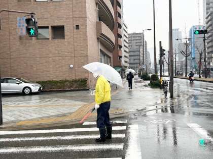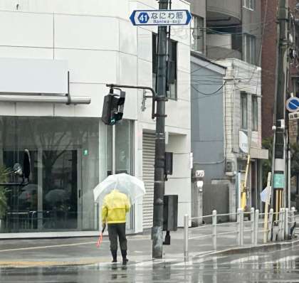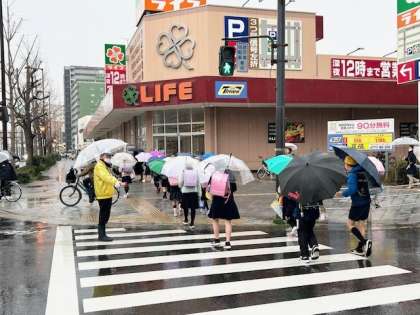雨の中、地域の皆様が子どもたちの見守りをしてくださっています。交差点の安全をありがとうございます。