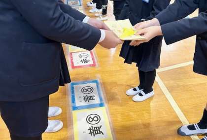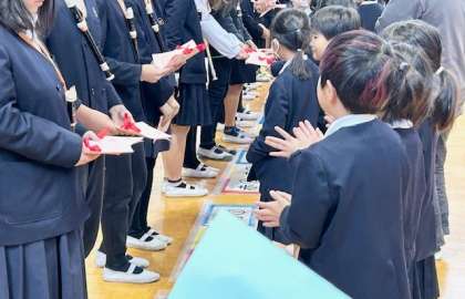 6年生に1年生から「おめでとうカード」を渡します。