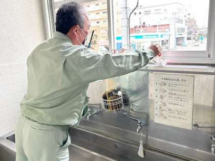管理作業員の日野さん。手洗い場に、スポンジの収納器具を取り付けてくださっています。
