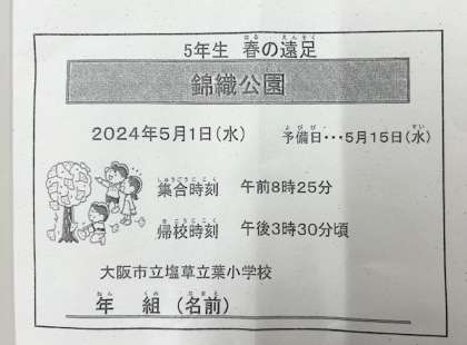 雨のため、5年生の遠足は、5月15日(水)に延期となりました。