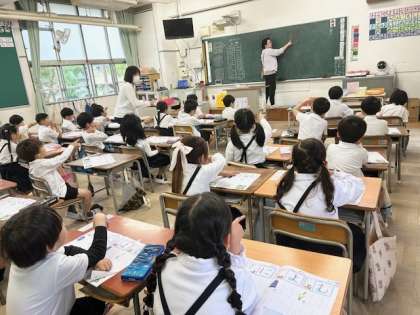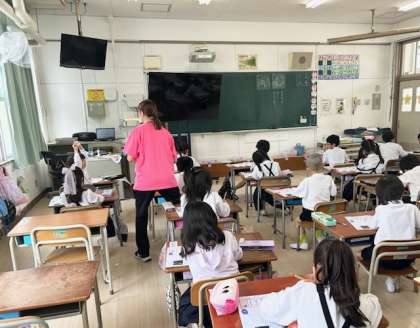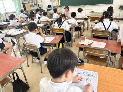 ひらがなの「む」を書いています。簡単そうに見えますが、難しいです。