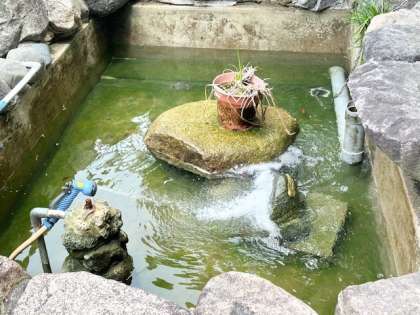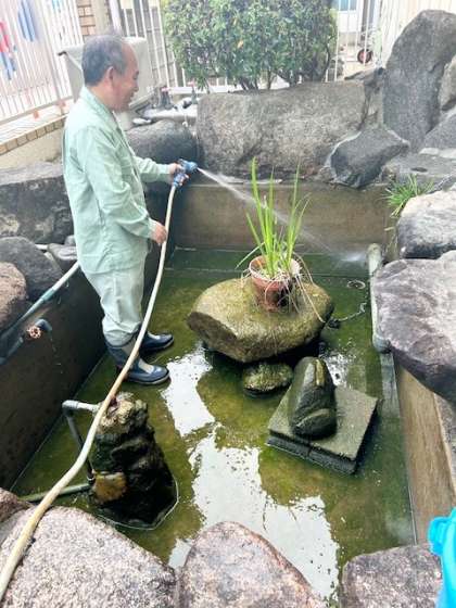 玄関の池を清掃しています。