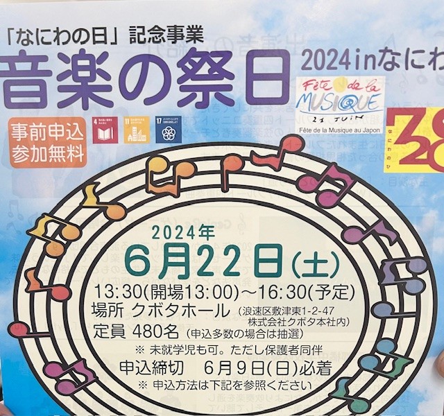 浪速区役所主催のイベントです。昨年も、大好評でした。申し込みは、お早めに。→音楽の祭日