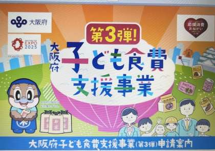 子育て世代に対する支援事業の広報チラシです。学校には6月に届く予定です。→大阪府子ども食費支援事業