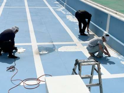 (株)オンテックス(大阪市浪速区湊町)の皆様が、プール底面の塗装をしてくださっています。とてもきれいになり、6月19日から始めるプール水泳が楽しみです。