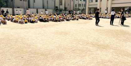 今日の2時限目、学校に不審者が入ってきたという想定で、避難訓練をしました。教職員が不審者役と確保役、警察への通報役などを分担する一方で、安全が確認できるまで子どもたちは教室内などに避難しました。最後は運動場に避難して、先生の話を聞きました。