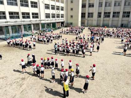 今朝は、全校児童が運動場に集まり、たてわり班で「落ちた落ちた」ゲームを楽しみました。