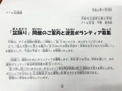 8月4日(日)午後5時から9時まで、第2グラウンドで盆踊りが行われます。