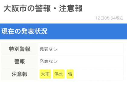 今朝も、大阪市に大雨、洪水、雷注意報が発令されています。