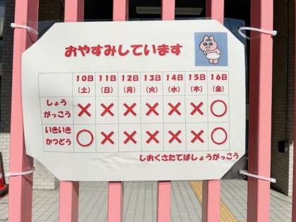 小学校は、15日まで業務を休ませていただいています。いきいき活動も同じです。
