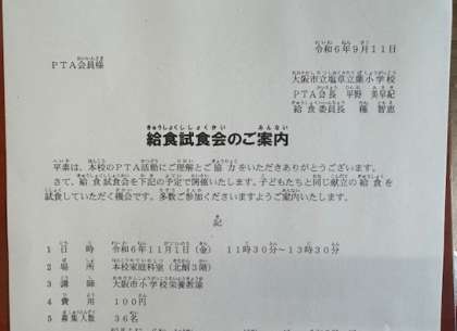 11月1日にPTA給食試食会を行います。PTA役員、給食委員会の皆さん、企画してくださり、ありがとうございます。申し込みは、9月20日(金)までです。ご参加をお待ちしています。→PTA給食試食会