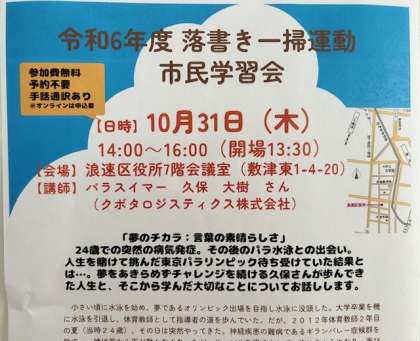10月31日(木)に、浪速区役所7階で行われます。パラリンピックに出場されたスイマーの久保 大樹さんのお話を聞きに行きましょう。