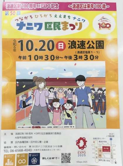 今年の区民まつりは、10月20日(日)10:30から15:30まで、浪速公園で行われます。なんと、浪速区は来年100歳!おめでとうございます。ポスター右下の会場管内図に塩草立葉小学校が載っていて、嬉しくなった投稿者です。→区民まつり