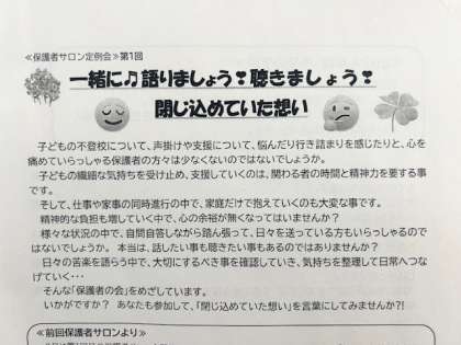 お子さんが学校に行きにくいなどで、ご心配やご不安をお持ちの保護者の皆様が集う場のご案内です。→保護者サロン定例会