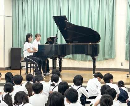 4年1組の井戸田先生と3年3組の李先生によるピアノ演奏(連弾)に、子どもたちは感動しています。ありがとうございました。