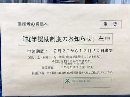 今日、6年生に就学援助費制度(早期1)の申請に必要な書類を封筒に入れて渡しました。ぜひお読みいただき、必要な書類をご提出ください。