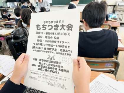 12月8日(日)は、塩草地域のもちつき大会です。今日、プリントを配りました。人数を把握したいので、参加する予定の方は、必要なことを書いて、提出してください。→もちつき大会