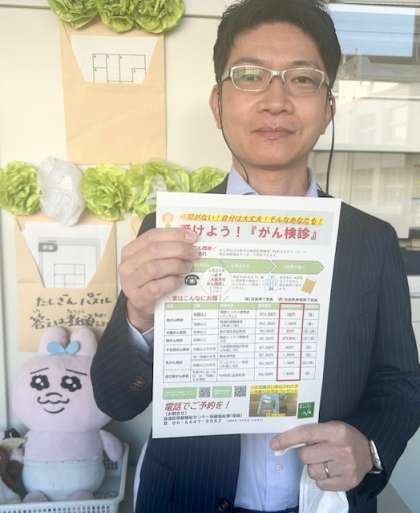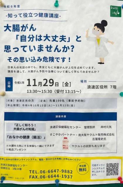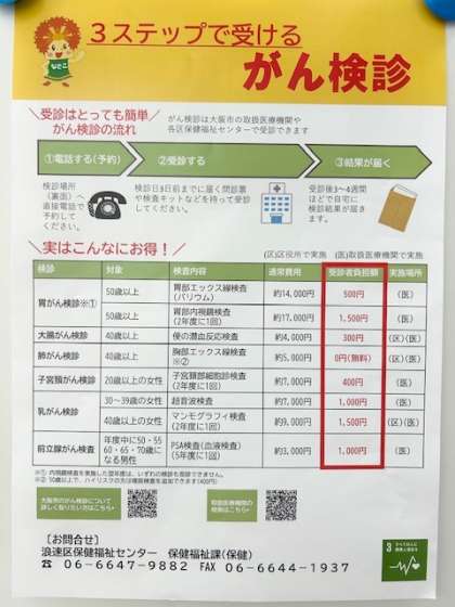 浪速保健福祉センターの保井課長代理が、がん検診に関する案内チラシをお届けくださいました。がん検診は、ひとごとではありません。実は、自分ごとです。それに、とってもお得です。近いうちに、子どもたちにチラシを配りますので、ぜひご覧いただき、浪速区役所または医療機関へお申し込みください。→受けよう!がん検診